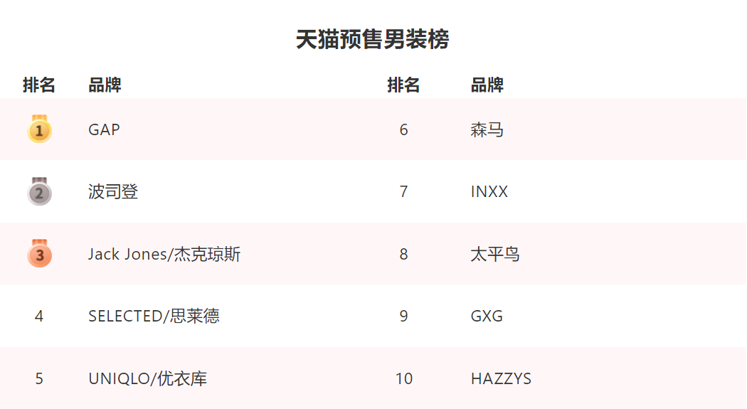 盡管Gap和思萊德一個賣身,一個撤店,但此次雙十一的預售榜仍然證明了他們作為巨頭的實力。