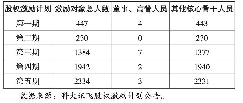 與我們前文所言相同,企業(yè)股權(quán)激勵對象除董事,高管之外,更側(cè)重于核心骨干人員,根據(jù)我們統(tǒng)計,科大訊飛前五期股權(quán)激勵份額所占普通股份額接近13%,這也再次驗證高技術(shù)企業(yè)在股權(quán)激勵中更為積極。