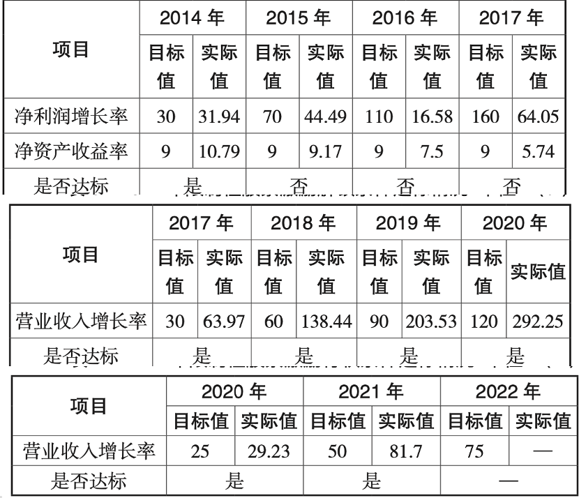 由于股權(quán)激勵的行權(quán)是以業(yè)績達標(biāo)為前提,我們就來看股權(quán)激勵下企業(yè)業(yè)績的達標(biāo)情況,見下圖