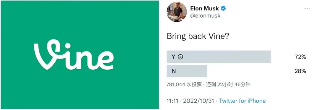 在收購?fù)瓿傻漠?dāng)天,馬斯克就在Twitter發(fā)起了一次投票:復(fù)活Vine?
