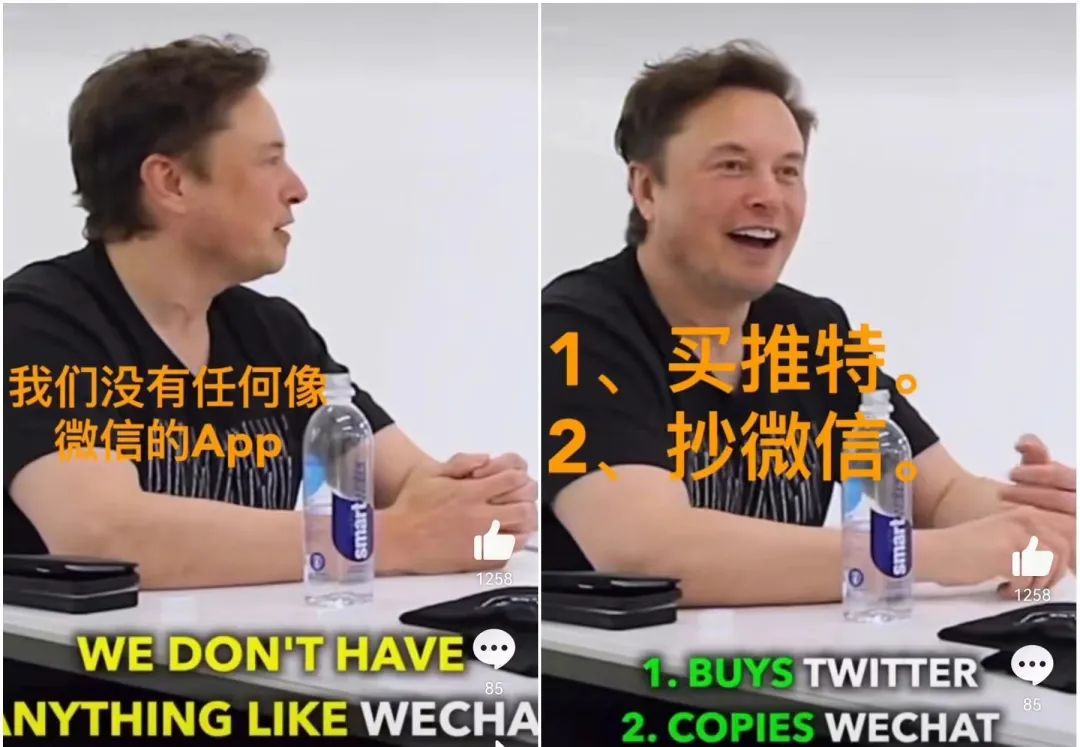 一段在國內(nèi)網(wǎng)友之間廣為流傳的視頻里,馬斯克毫不掩飾地表達(dá)著自己對于微信的贊許之情,“它很好,微信很棒。而在中國以外,還沒有像微信這樣的東西。我說,讓我們來抄微信怎么樣?買Twitter,抄微信。”