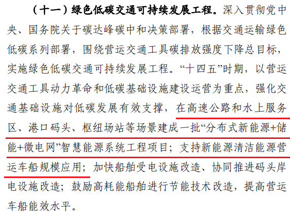 2022年3月30日,交通運輸部就印發(fā)了《扎實推動“十四五”規(guī)劃交通運輸重大工程項目實施工作方案》。方案提出在“十四五”時期,要以營運交通工具動力革命和低碳基礎(chǔ)設(shè)施建設(shè)運營為重點,強化交通基礎(chǔ)設(shè)施對低碳發(fā)展有效支撐,在高速公路和水上服務(wù)區(qū)、港口碼頭、樞紐場站等場景建成一批“分布式新能源+儲能+微電網(wǎng)”智慧能源系統(tǒng)工程項目;支持新能源清潔能源營運車船規(guī)模應(yīng)用。