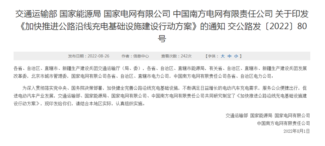 交通運輸部、國家能源局、國家電網(wǎng)有限公司、中國南方電網(wǎng)有限責(zé)任公司印發(fā)《加快推進公路沿線充電基礎(chǔ)設(shè)施建設(shè)行動方案》。方案要求加強高速公路服務(wù)區(qū)充電基礎(chǔ)設(shè)施建設(shè),重大節(jié)假日期間預(yù)測流量較大的服務(wù)區(qū)要提前做好應(yīng)急預(yù)案,適當(dāng)投放移動充電基礎(chǔ)設(shè)施,滿足高峰時段充電需求。