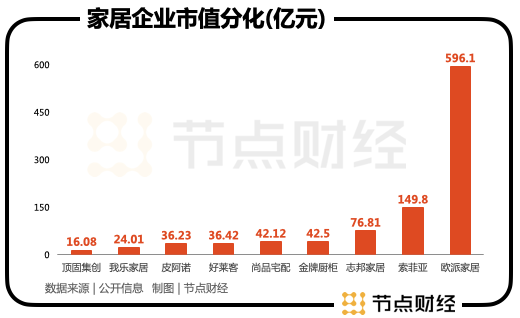 與業(yè)績有同樣走勢的還有資本價(jià)值分化。截至11月11日收盤,歐派家居的市值接近600億元,遙遙領(lǐng)先其他幾家。