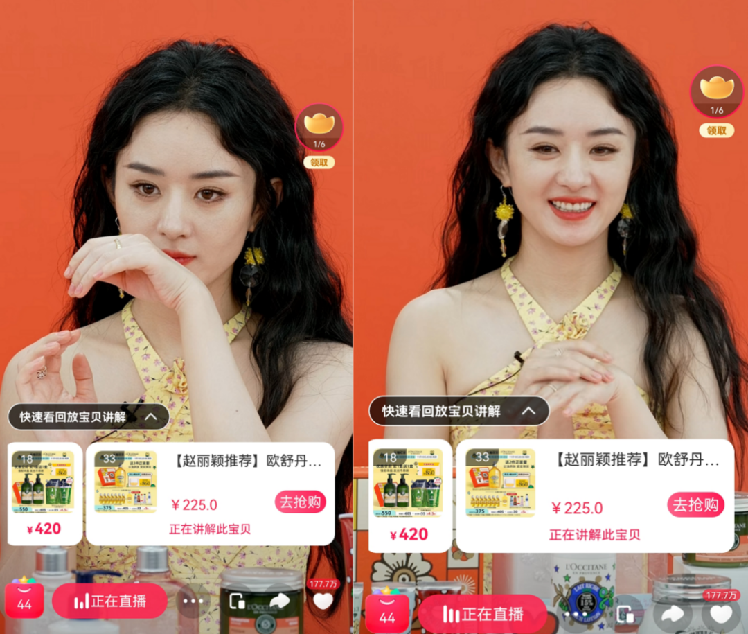 但在她參與的歐舒丹直播間,便有藝人辨別產(chǎn)品香氣、親自上手涂抹身體乳的環(huán)節(jié),當(dāng)天趙麗穎穿著的淡黃色禮服裙也更為匹配產(chǎn)品甜美的概念,再加上實時使用后對香氣的評價,說服力就高得多。