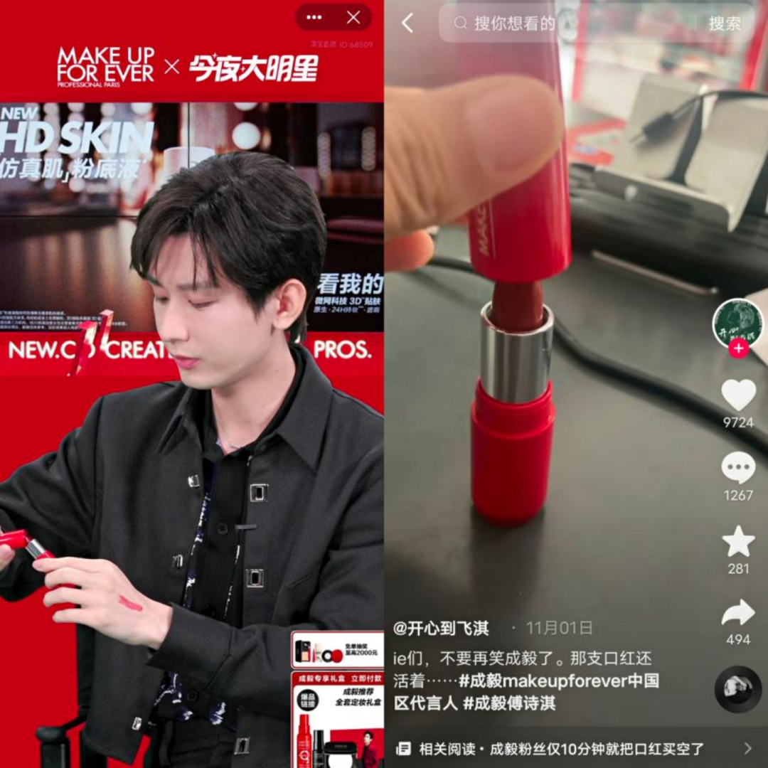 期間就出現(xiàn)了一個很有趣的情節(jié)。按照主持人要求,成毅在手上畫下口紅痕跡后,沒有將口紅擰進(jìn)去而是直接蓋上。這一舉動瞬間引發(fā)了不少網(wǎng)友調(diào)侃,“直男式蓋口紅看得好心痛,強迫癥犯了”。隨后在平臺出現(xiàn)了網(wǎng)友親身下場用同款口紅實踐,告知大家“那支口紅到底怎么樣”的實驗結(jié)果。