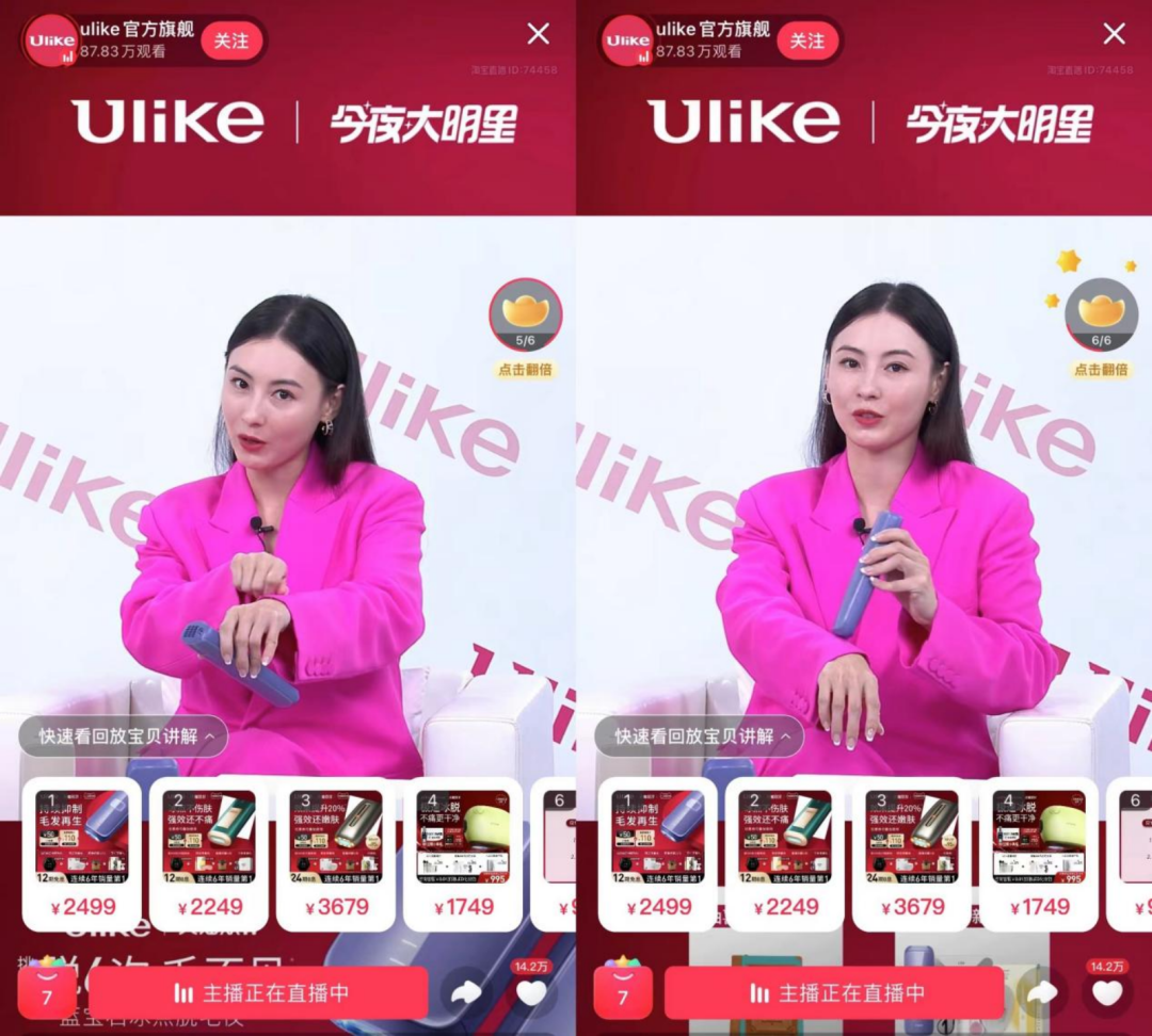 去年雙11在經(jīng)驗不足、普通話不夠好的情況下取得了亮眼帶貨成績的張柏芝,今年在脫毛儀品牌ULIKE的直播間打出了一場"翻身仗"。