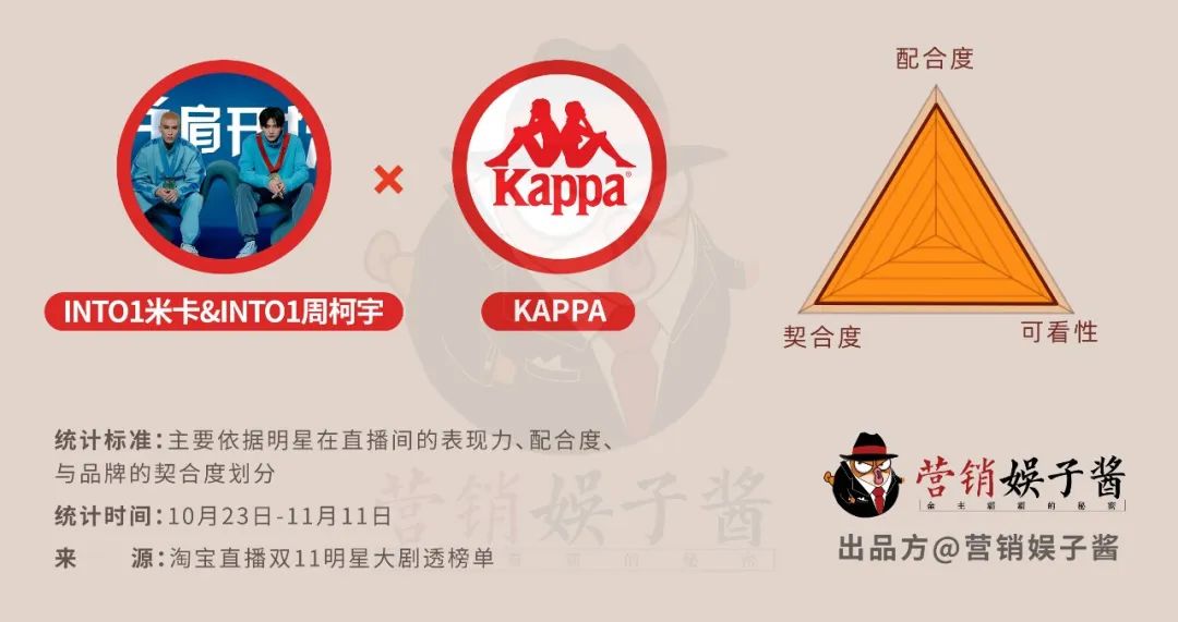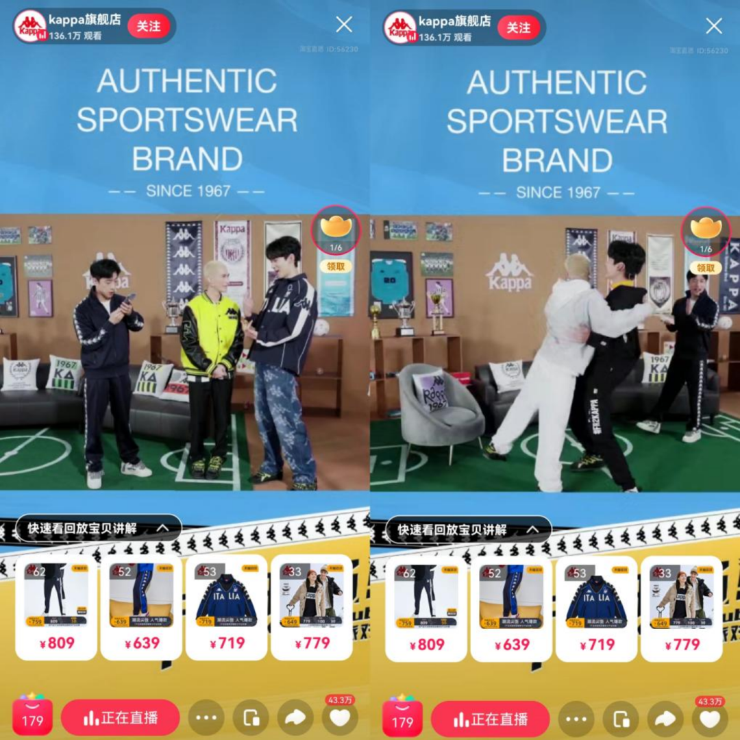 以KAPPA為例,雙十一期間品牌邀請了INTO1米卡、INTO1周柯宇來到直播間,借勢即將到來的世界杯東風(fēng),把整個直播間布置成了一個看球的轟趴館,一下子便明確了品牌體育潮流的概念。兩位偶像穿著品牌服飾上場,很自然在主持人引導(dǎo)下聊起足球、穿搭等話題,自然而然把產(chǎn)品介紹融入其中,期間周柯宇不僅充當(dāng)起米卡的“中譯中”翻譯,兩人互相調(diào)侃的過程也增加了直播間的趣味看點。