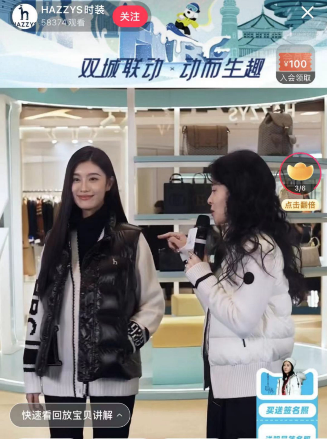 張碧晨與hazzys品牌的合作也屬此類。在明星出場環(huán)節(jié),品牌切換到了青島萬象城現(xiàn)場開播,并且請到了運動員出鏡配合品牌本季的滑雪主題,張碧晨本人則身著全套品牌當(dāng)季新品上場,確實做到了耳目一新的效果。