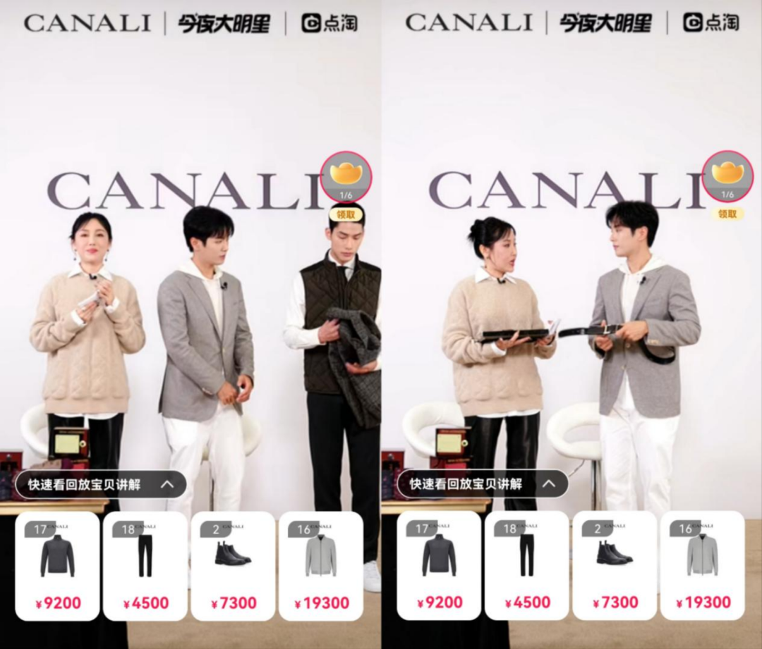 對比之下,李汶翰與CANALI男裝的直播合作設(shè)計便更為合理,服裝展示模特挨個上臺,采用同屏的方式,大多數(shù)時間保持藝人與服飾、主播同框,不僅能展示細(xì)節(jié),也有更多藝人與產(chǎn)品的有效上手互動,李汶翰本身和女主播帶些趣味性的玩?;桓窃黾恿丝袋c。