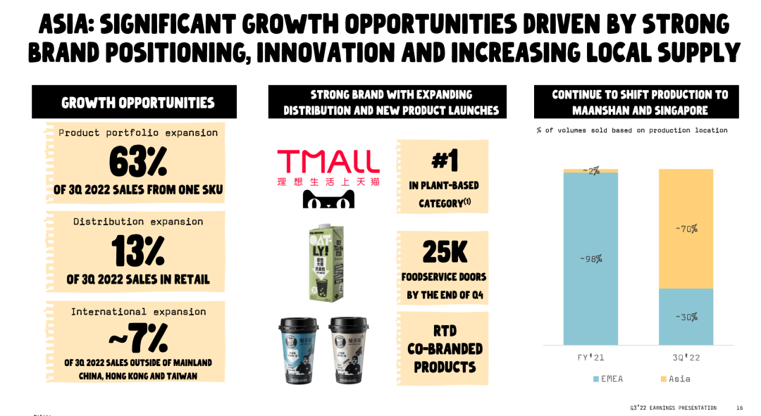 據了解,OATLY正持續(xù)將產能轉移到位于安徽馬鞍山和新加坡的兩座亞洲工廠。在三季度,亞洲市場70%的銷量來自上述兩家工廠,而在2021年底這個數字還只有2%。