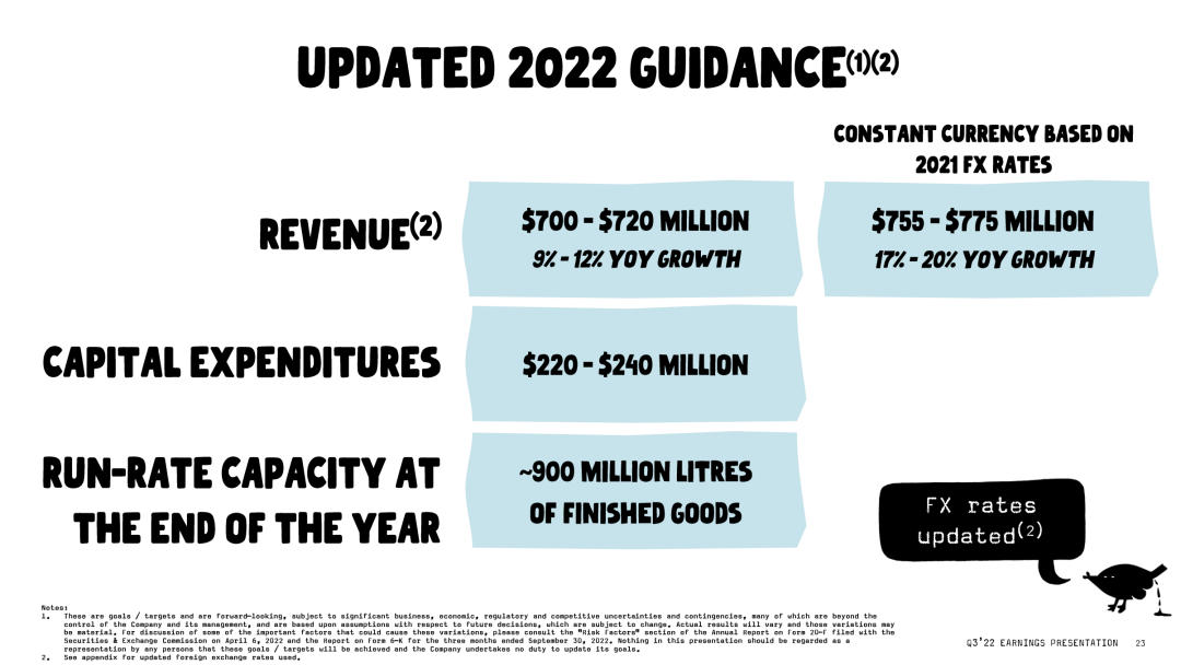 今天,OATLY還宣布下調全年指引,將2022年收入預期從原先的8億~8.3億美元降至7億~7.2億美元,同比增長9%至12%;資本支出維持不變,仍是2.2億~2.4億美元。
