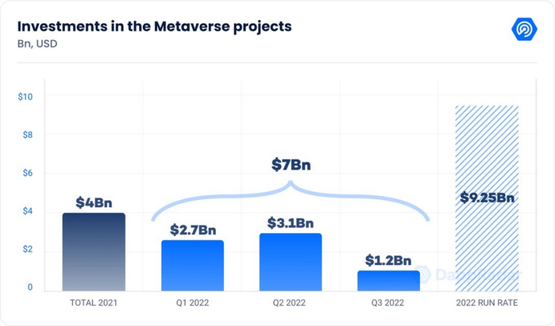 數(shù)據(jù)顯示,元宇宙和Web3游戲項(xiàng)目在2022年已累計(jì)融資約70億美元,第三季度的融資額達(dá)到12億美元