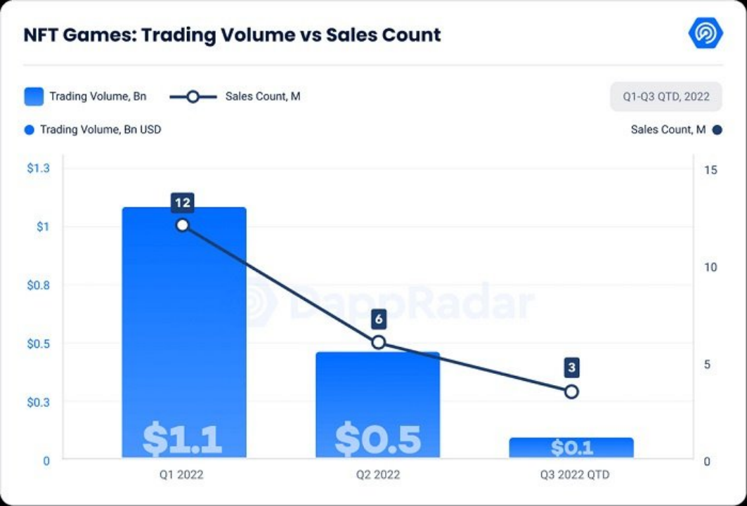 DappRader數(shù)據(jù)顯示,今年一季度,游戲 NFT 總交易額超過10億美元,二季度下跌了53%,三季度進(jìn)一步暴跌到7100萬美元,跌幅高達(dá) 84%。