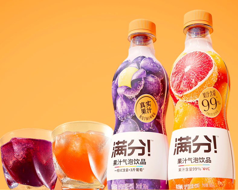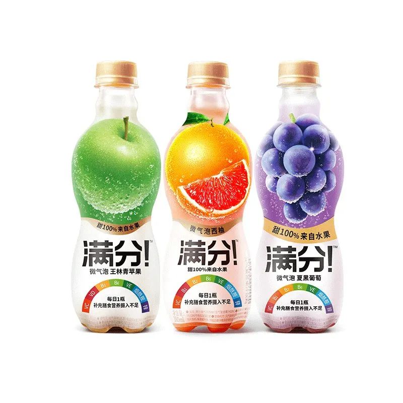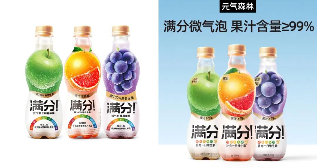 滿(mǎn)分選擇將“果汁含量99%”的圖案放大;又從在瓶身上半部分放一個(gè)橙子、一串葡萄,改為在整個(gè)包裝上堆滿(mǎn)水果圖案;還在白底文字部分,刪去了所有對(duì)多種維生素的宣傳,改為強(qiáng)調(diào)“果汁氣泡飲品”。