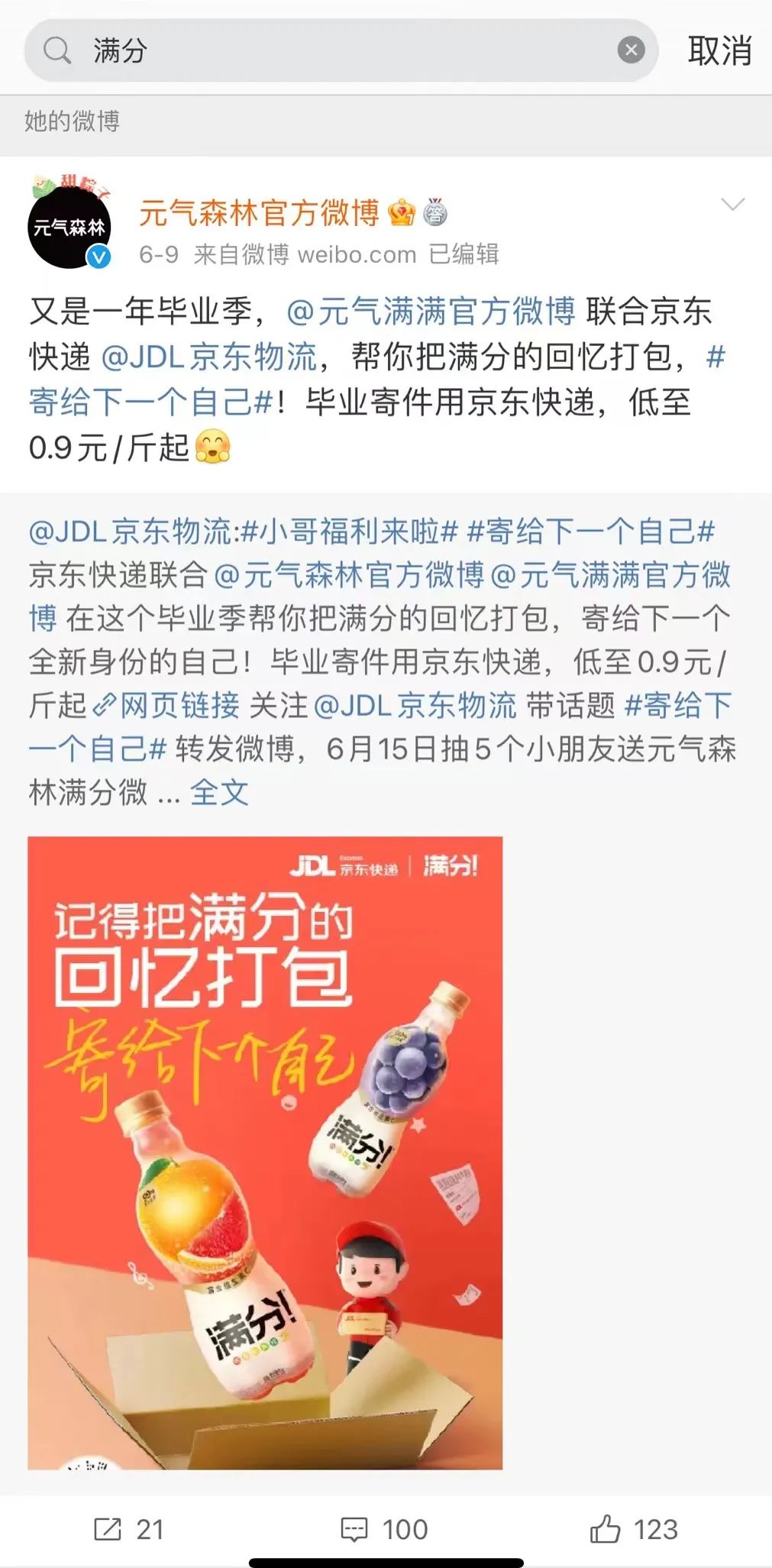 搜索“滿(mǎn)分微氣泡”相關(guān)動(dòng)態(tài),發(fā)現(xiàn)大多新聞稿還停留在2021年。2022年起,品牌在小紅書(shū)上投放的種草宣傳明顯減少。而元?dú)馍值墓俜轿⒉?,今年僅轉(zhuǎn)發(fā)過(guò)一條滿(mǎn)分相關(guān)的微博。