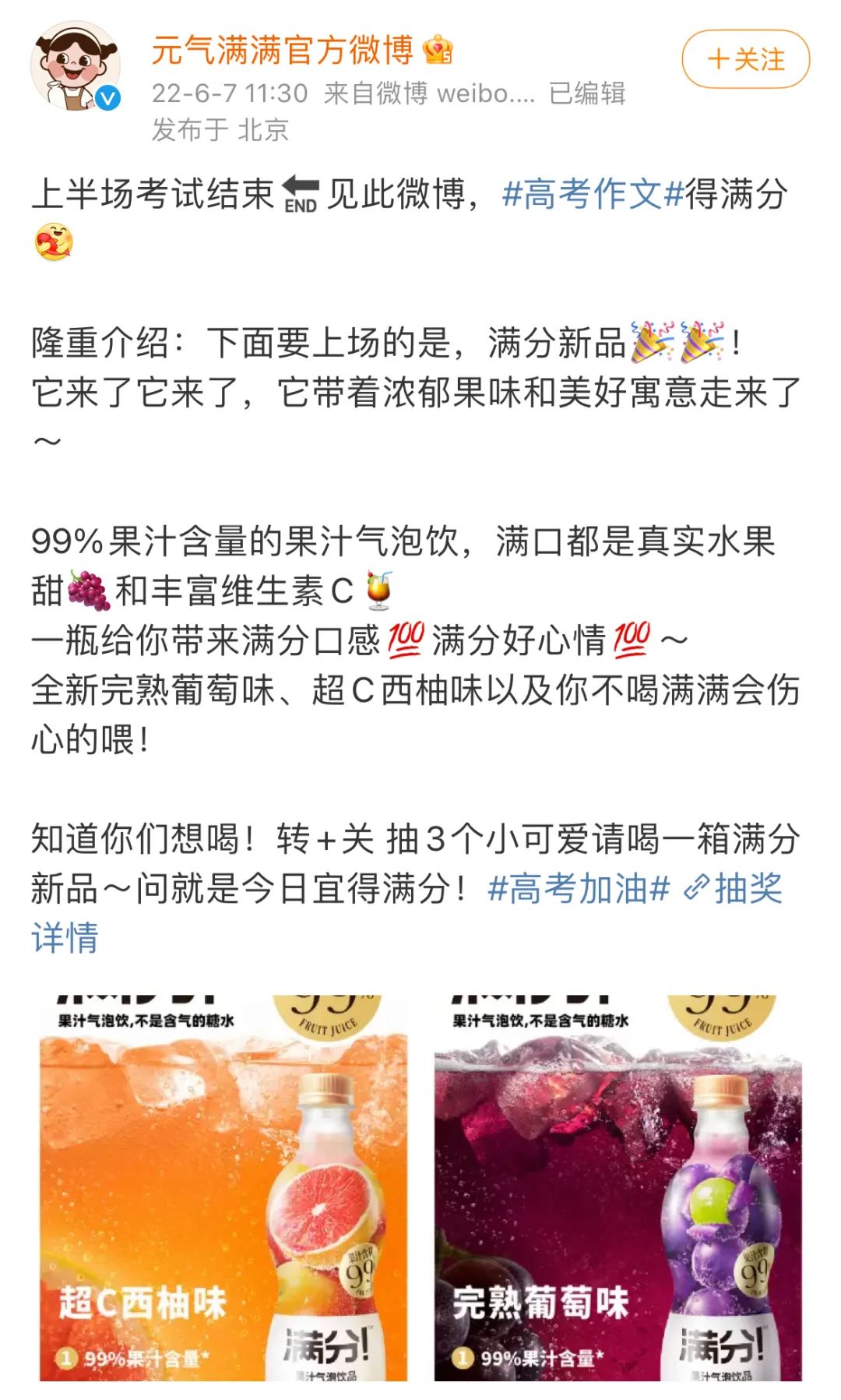 今年6月,滿(mǎn)分悄悄在“元?dú)鉂M(mǎn)滿(mǎn)”官方賬號(hào)走起“支線劇情”?!霸?dú)鉂M(mǎn)滿(mǎn)官方微博”宣布推出滿(mǎn)分新品“超C西柚味”和“完熟葡萄味”,同時(shí)在“元?dú)鉂M(mǎn)滿(mǎn)旗艦店”低調(diào)上線新品。