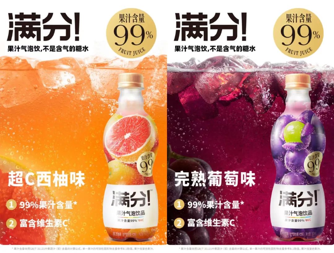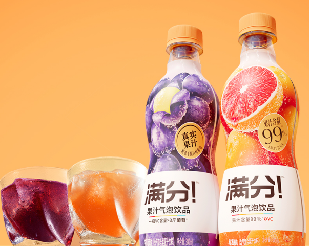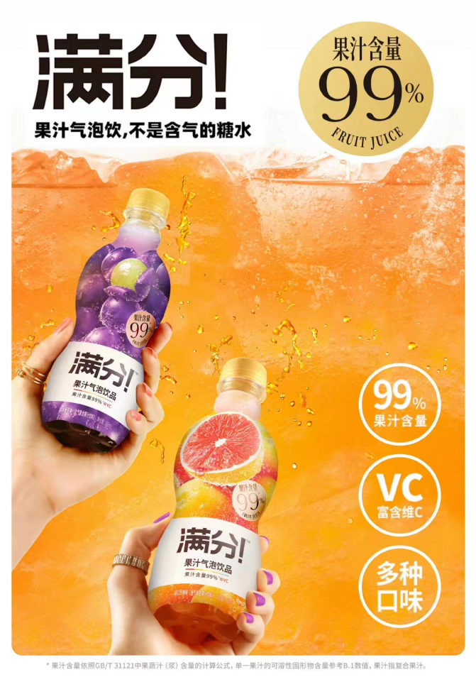 滿(mǎn)分在今年6月測(cè)試時(shí),喊出了“果汁氣泡,每一口都有真實(shí)果汁”的口號(hào)。品牌似乎想要改變消費(fèi)者對(duì)果汁氣泡飲料“并非是使用真實(shí)果汁而是添加劑”的固有認(rèn)知。