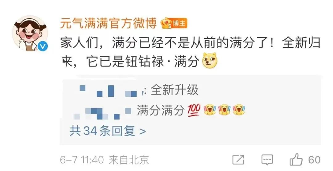 元?dú)鉂M(mǎn)滿(mǎn)官方微博還評(píng)論稱(chēng),滿(mǎn)分已經(jīng)不是從前的滿(mǎn)分了,而是“鈕祜祿·滿(mǎn)分”。