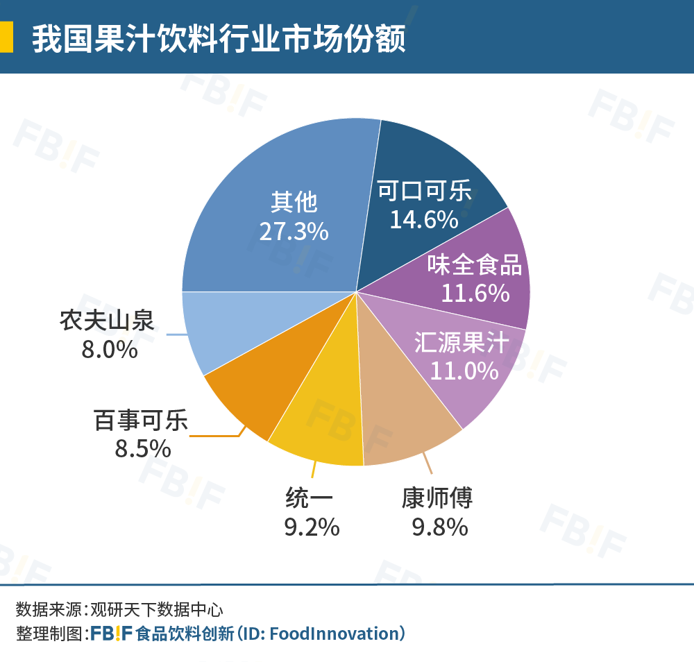 在整個(gè)中國(guó)飲料市場(chǎng),果汁份額正在逐漸縮小。中國(guó)飲料協(xié)會(huì)公布的數(shù)據(jù)顯示,到了2020年,中國(guó)飲料市場(chǎng)開(kāi)始呈現(xiàn)以包裝飲用水、即飲茶飲料和碳酸飲料為主的新格局,果汁飲料被擠出前三。