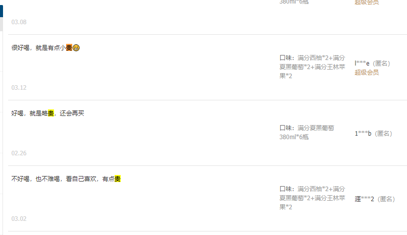 我們了解到,元?dú)馍肿?020年就開(kāi)始監(jiān)測(cè)用戶(hù)對(duì)滿(mǎn)分的評(píng)價(jià)。其中很多用戶(hù)反饋滿(mǎn)分喝起來(lái)甜膩、喝完一整瓶有壓力,還有的消費(fèi)者沒(méi)有注意到滿(mǎn)分所宣傳的“富含多種維生素”。