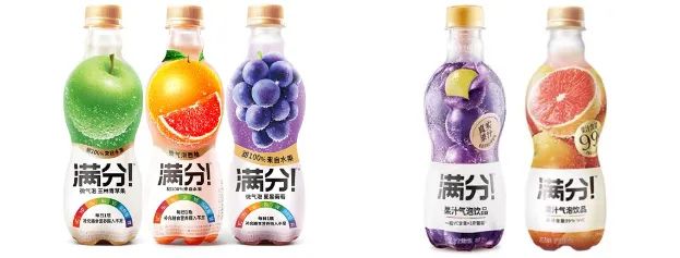 第二次的改變,則對(duì)包裝進(jìn)行了“整體改造”。滿(mǎn)分告訴我們,以前的設(shè)計(jì)讓用戶(hù)無(wú)法區(qū)分滿(mǎn)分和氣泡水的區(qū)別,感受不到真實(shí)果汁。品牌希望產(chǎn)品的包裝設(shè)計(jì),能將滿(mǎn)分的價(jià)值傳達(dá)出去。