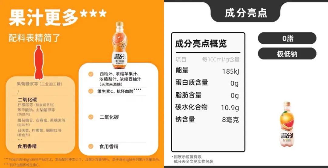 可這樣真的能將滿(mǎn)分的價(jià)值傳遞給消費(fèi)者嗎?我們發(fā)現(xiàn),有部分購(gòu)買(mǎi)滿(mǎn)分的消費(fèi)者,認(rèn)為還是之前標(biāo)注多種營(yíng)養(yǎng)成分的包裝更有價(jià)值感。他們選擇滿(mǎn)分,就是因?yàn)閭鹘y(tǒng)果汁汽水不含各類(lèi)維生素,且果味來(lái)源于添加劑而非真實(shí)果汁。