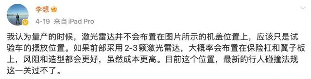 李想表示,激光雷達(dá)放在車(chē)頂還是放在機(jī)蓋和保險(xiǎn)杠上,從性能上沒(méi)有任何區(qū)別。但車(chē)頂激光雷達(dá)的造型需要適應(yīng)。他表示,量產(chǎn)的時(shí)候,激光雷達(dá)并不會(huì)布置在機(jī)蓋位置,大概率會(huì)布置在保險(xiǎn)杠和翼子板上,風(fēng)阻和造型都會(huì)很好,雖然成本很高,但是合規(guī)范圍內(nèi)只能這么做。