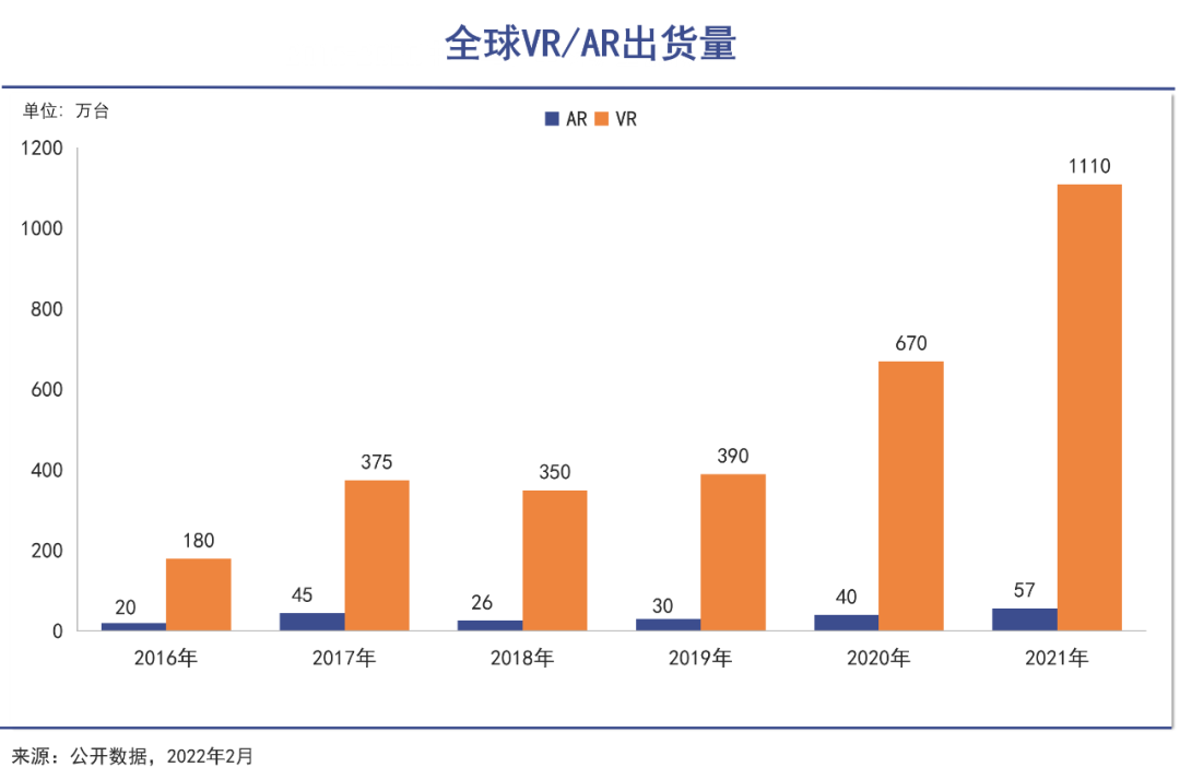 距離VR硬件行業(yè)頭部企業(yè)Oculus 發(fā)布首臺原型機已經(jīng)過去了十二年,快速發(fā)展后的全球VR硬件出貨量在2021年達(dá)到了1110萬臺,VR/AR 硬件與內(nèi)容生態(tài)也形成了協(xié)同發(fā)展的正循環(huán)。