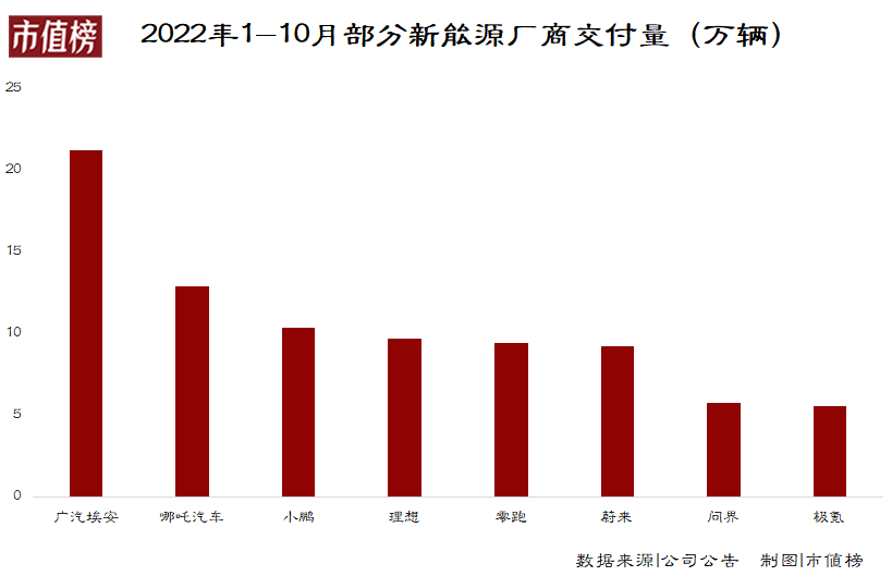 再將對比范圍擴大一些,在新勢力車企中,蔚來去年10月還是累計銷量冠軍,今年已經(jīng)掉到第六名。今年前10個月,第一名廣汽埃安的交付量,相當于2.3個蔚來,此前榜上無名的哪吒,也已經(jīng)甩開蔚來1/3個身位。