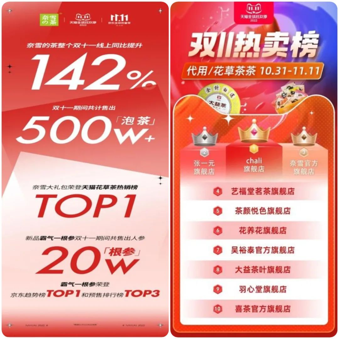 相對于現(xiàn)制產(chǎn)品,預(yù)制產(chǎn)品更適應(yīng)于無限場景。在日前的雙11數(shù)據(jù)中,奈雪電商銷量同比增長142%,售出超過500萬份袋泡茶。其中奈雪“霸氣大禮包”登上天貓花草茶熱銷榜第一;茶禮盒新品“霸氣一根參”登上了京東花草趨勢榜TOP1。