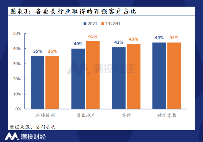 誠然,高銷售及研發(fā)費(fèi)用讓微盟無可避免地陷入了虧損的困境,但連續(xù)的資金投入其實(shí)換來了公司在電商SaaS行業(yè)發(fā)展的底氣,為其帶來了較高的市場認(rèn)可度。2022年上半年公司在商業(yè)地產(chǎn)、餐飲等垂類行業(yè)的百強(qiáng)客戶數(shù)量均有所提升,占比也近半,大客化戰(zhàn)略進(jìn)展較為順利。