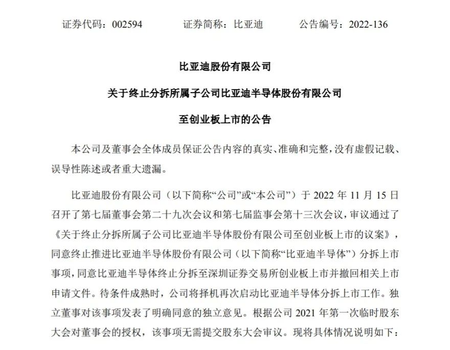 讓人意外的是,就在“巴菲特抄底臺積電”新聞發(fā)出的當(dāng)天,比亞迪發(fā)布公告稱,終止推進控股子公司比亞迪半導(dǎo)體的分拆上市事項,并表示待公司完成相關(guān)投資擴產(chǎn)后且條件成熟時,將擇機再次啟動分拆上市。