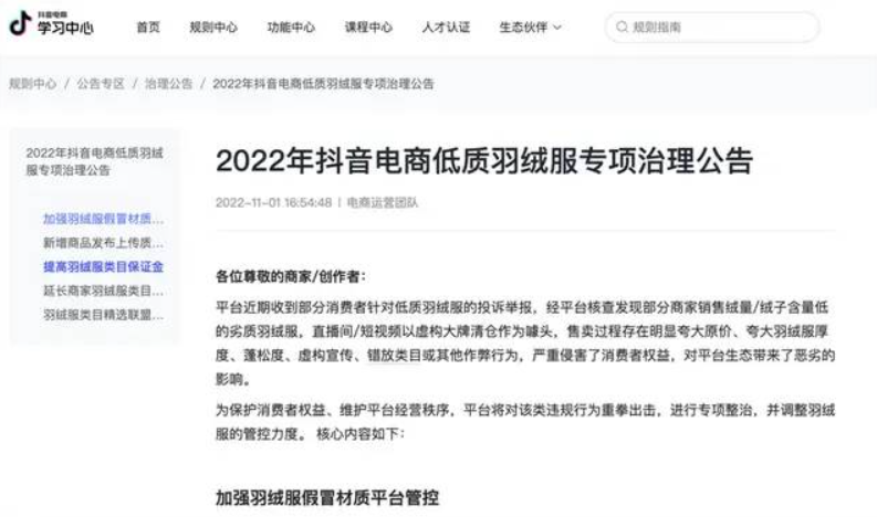 11月,抖音出臺(tái)了專(zhuān)項(xiàng)治理低質(zhì)羽絨服的規(guī)則(下稱(chēng)“抖音羽絨服規(guī)則”),不再允許平臺(tái)商戶(hù)售賣(mài)50%以下絨子含量的成衣,要求羽絨服品類(lèi)商品發(fā)布須上傳真實(shí)有效的商品質(zhì)檢報(bào)告(包含材質(zhì)或成衣質(zhì)檢),其中50絨(即含絨量/絨子含量為50%)羽絨服必須上傳成衣質(zhì)檢報(bào)告,并將經(jīng)營(yíng)羽絨服品類(lèi)企業(yè)店/個(gè)體店保證金調(diào)整至5萬(wàn)元。