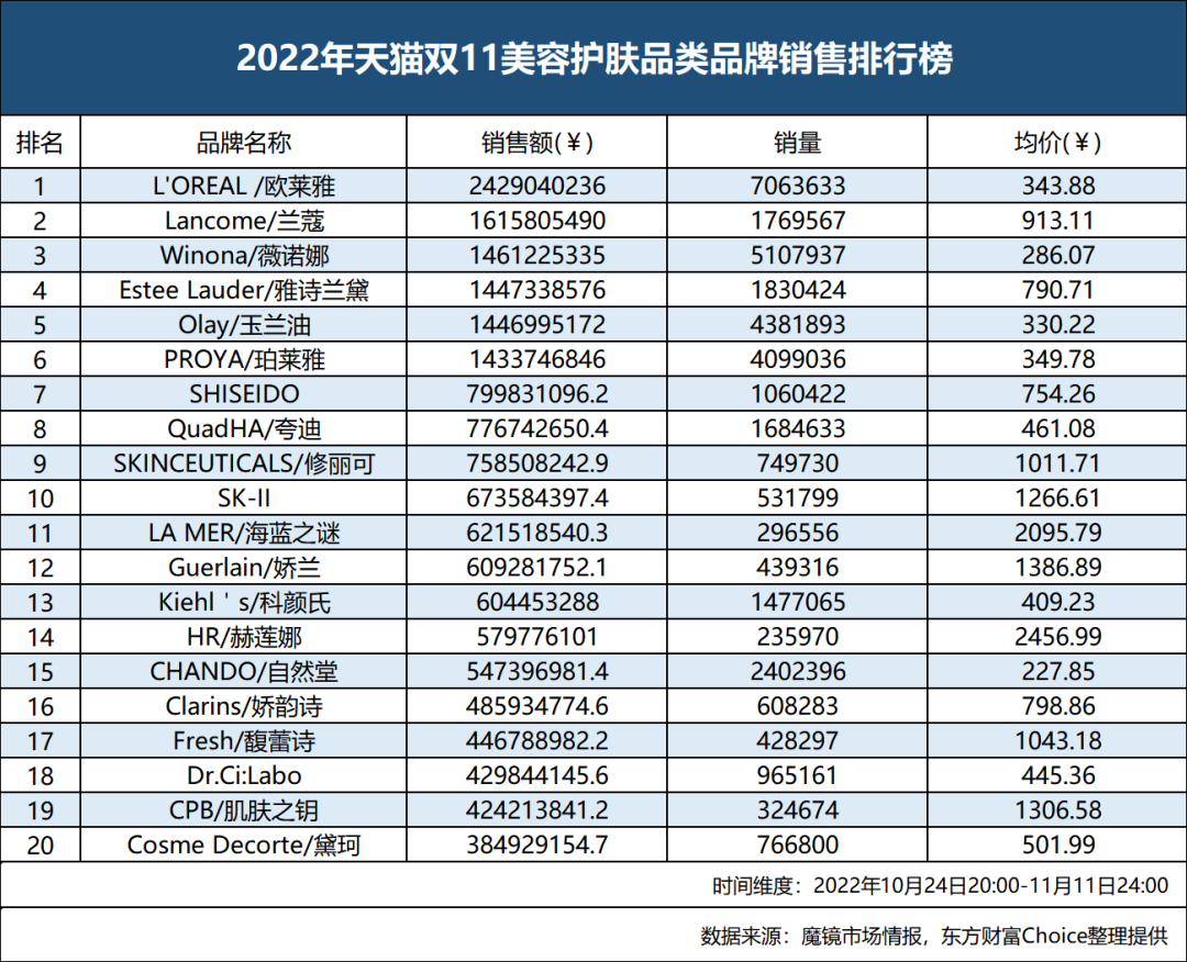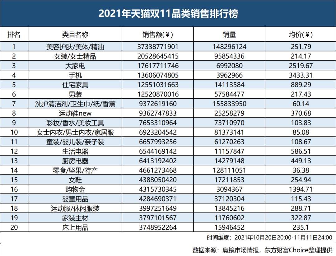 根據(jù)魔鏡市場(chǎng)情報(bào)數(shù)據(jù)(東方財(cái)富Choice整理提供),今年天貓雙11銷售額第一大品類依然是美容護(hù)膚,從銷售額和銷售量來(lái)看,分別同比下降了12.8%和23.2%。