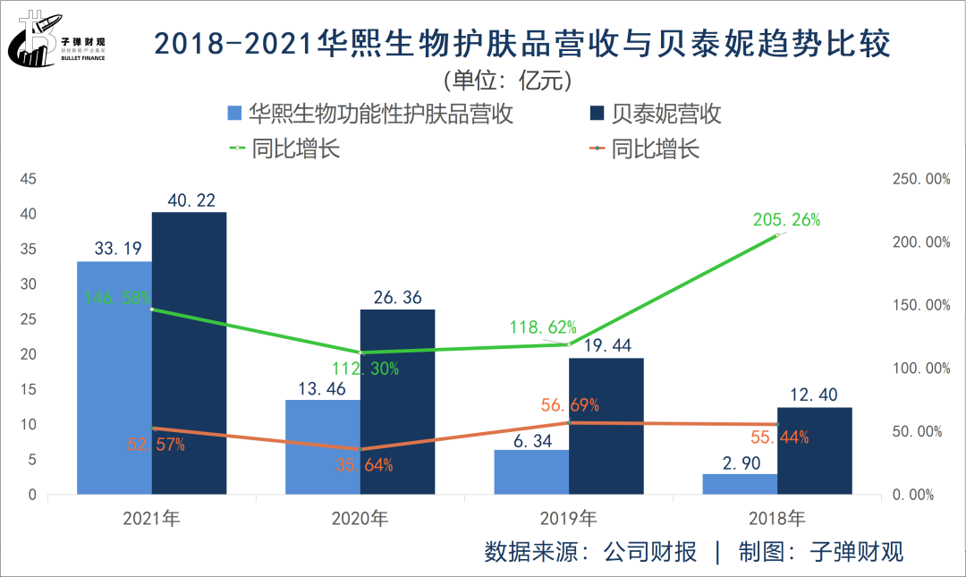 2018-2021年,華熙生物護(hù)膚品業(yè)務(wù)增速一直保持在100%以上,而貝泰妮則穩(wěn)定在50%左右。