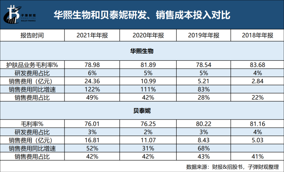 營(yíng)收和增速只是一方面。雖然華熙生物和貝泰妮毛利潤(rùn)都維持在80%左右,整體區(qū)別不大,但在研發(fā)、營(yíng)銷投入上,二者差別明顯。