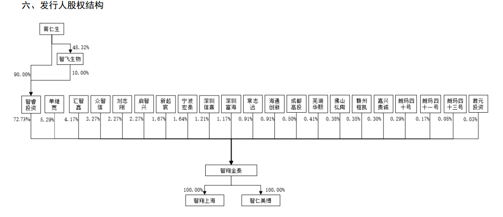 截至招股說明書簽署日,智睿投資直接持有公司72.73%的股份,蔣仁生直接持有智睿投資 90%股權(quán),并通過其控制的智飛生物持有智睿投資 10%股權(quán)。實(shí)際上,蔣仁生為公智翔金泰的實(shí)際控制人。