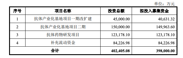 智翔金泰本次IPO擬募資39.8億元,其中,4.06億元用于抗體產(chǎn)業(yè)化基地項(xiàng)目一期改擴(kuò)建,14.99億元用于抗體產(chǎn)業(yè)化基地項(xiàng)目二期,12.32億元用于抗體藥物研發(fā)項(xiàng)目,8.42億元用于補(bǔ)充流動資金。