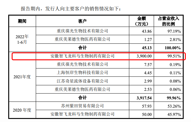 2020年,智翔金泰向智飛龍科馬銷售金額為50.00萬元,占營業(yè)收入比例為45.97%。