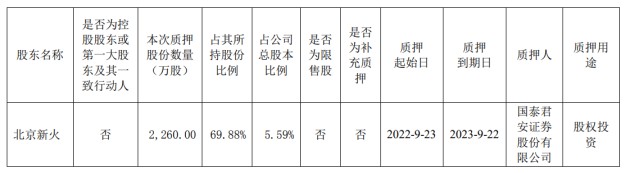 在那一次股份轉(zhuǎn)讓的大約五個月后,9月27日,金智科技披露《關(guān)于持股5%以上股東部分股份質(zhì)押的公告》稱,持股5%以上股東北京新火將其所持有的2260萬股金智科技股份用于質(zhì)押,占其所持股份的69.88%,質(zhì)押用途為“股權(quán)投資”。