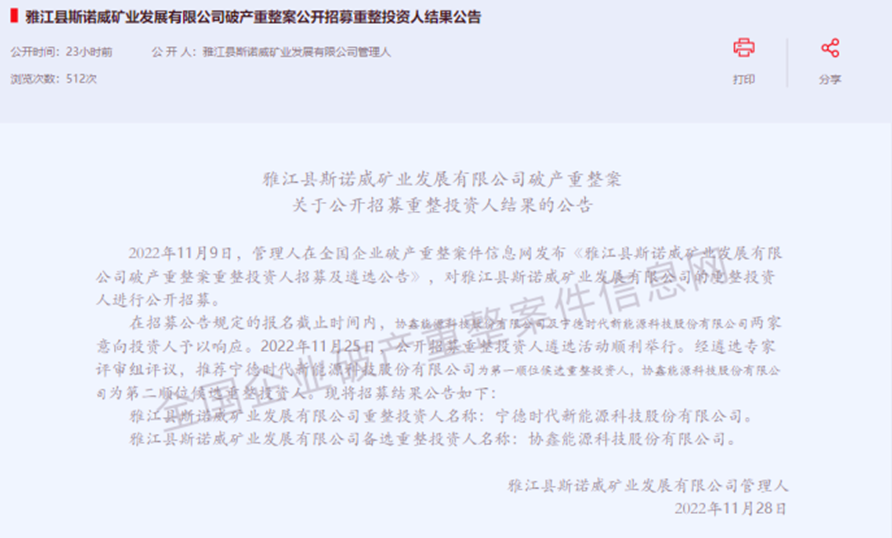 11月28日,斯諾威管理人宣布,11月25日斯諾威公開招募重整投資人遴選活動(dòng)舉行,經(jīng)遴選專家評審組評議,寧德時(shí)代為第一順位候選重整投資人,協(xié)鑫能科為第二順位候選重整投資人。