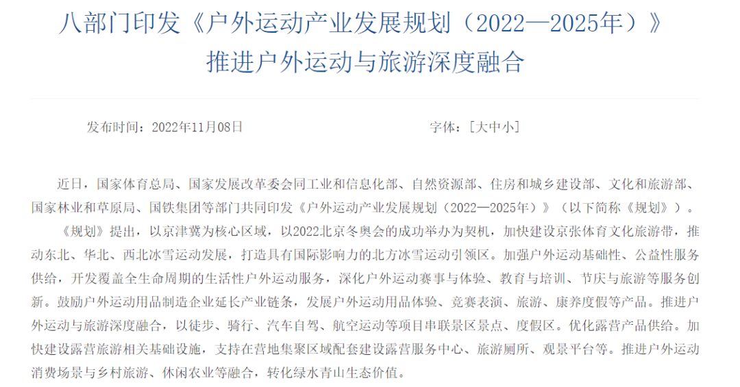 不過值得一提的是露營行業(yè)在逐漸規(guī)范化發(fā)展。近期,國家體育總局等八部門共同印發(fā)的《戶外運動產(chǎn)業(yè)發(fā)展規(guī)劃(2022—2025年)》提出,優(yōu)化露營產(chǎn)品供給。鼓勵開放郊野公園提供露營服務(wù),在城市郊野、農(nóng)村地區(qū)等建設(shè)更多露營基地,滿足群眾就近就便露營需求。