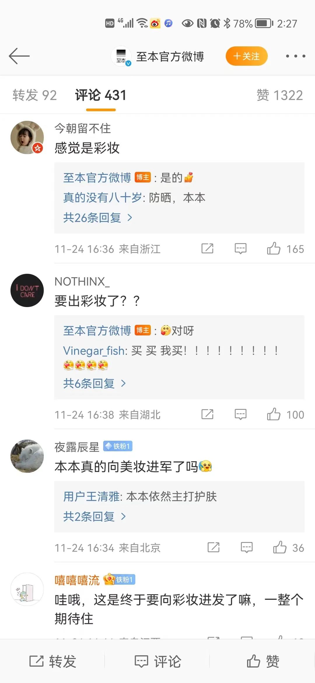在微博、小紅書等社交媒體平臺上,不少網(wǎng)友表示,“至本那么好用彩妝應(yīng)該不會差”、“從至本追隨而來,狠狠期待了”。也有網(wǎng)友提出了不少對產(chǎn)品的期望“希望不要太貴”、“需要防曬”“不在乎價格,一定要好用”。