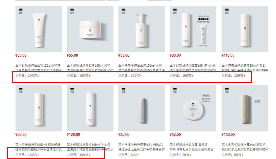 C2CC傳媒X新妝資訊還注意到,至本多款產(chǎn)品榮登天貓榜單第一:至本舒顏修護潔面乳位列天貓敏感肌洗面奶熱銷榜TOP 1,舒顏修護卸妝膏位列天貓卸妝用品熱銷榜榜TOP 1,特安修護潔面泡位列天貓慕斯洗面奶回購榜TOP 1……且上述產(chǎn)品總銷量均達到100萬+件。按銷量排名,至本有7款總銷量過100萬+件的產(chǎn)品。