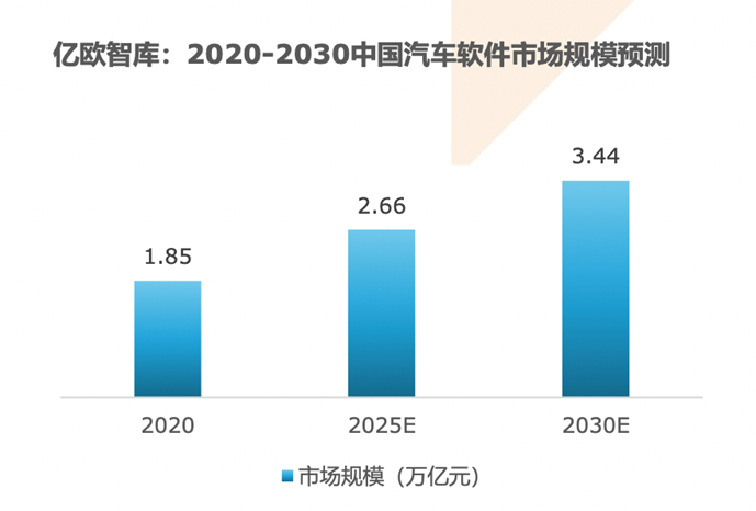 億歐智庫預(yù)計,隨著軟件的價值在汽車中被放大,2030年中國汽車軟件市場規(guī)模將增長至3.44萬億元,年復(fù)合增長率為7%。軟件在整車價值有望達到65%,將成為未來汽車行業(yè)最重要的領(lǐng)域。