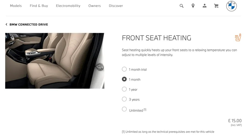 也不盡然,以寶馬推出的座椅加熱付費訂閱包為例,價格是每個月122元。買斷功能需要2700元,而國內(nèi)每年使用該功能的時間為兩三個月,這樣推算的話,訂閱功能可能就更為劃算。