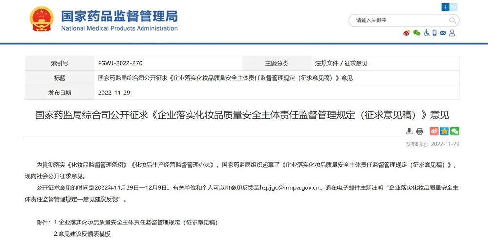 11月29日,國家藥監(jiān)局官網(wǎng)發(fā)布了《企業(yè)落實(shí)化妝品質(zhì)量安全主體責(zé)任監(jiān)督管理規(guī)定(征求意見稿)》(以下簡稱“征求意見稿”),其中涉及到化妝品質(zhì)量安全關(guān)鍵崗位要求、質(zhì)量安全管理機(jī)制和監(jiān)督管理的相關(guān)規(guī)范。公開征求意見的時間為2022年11月29日至12月9日,新規(guī)將于2023年正式實(shí)行。