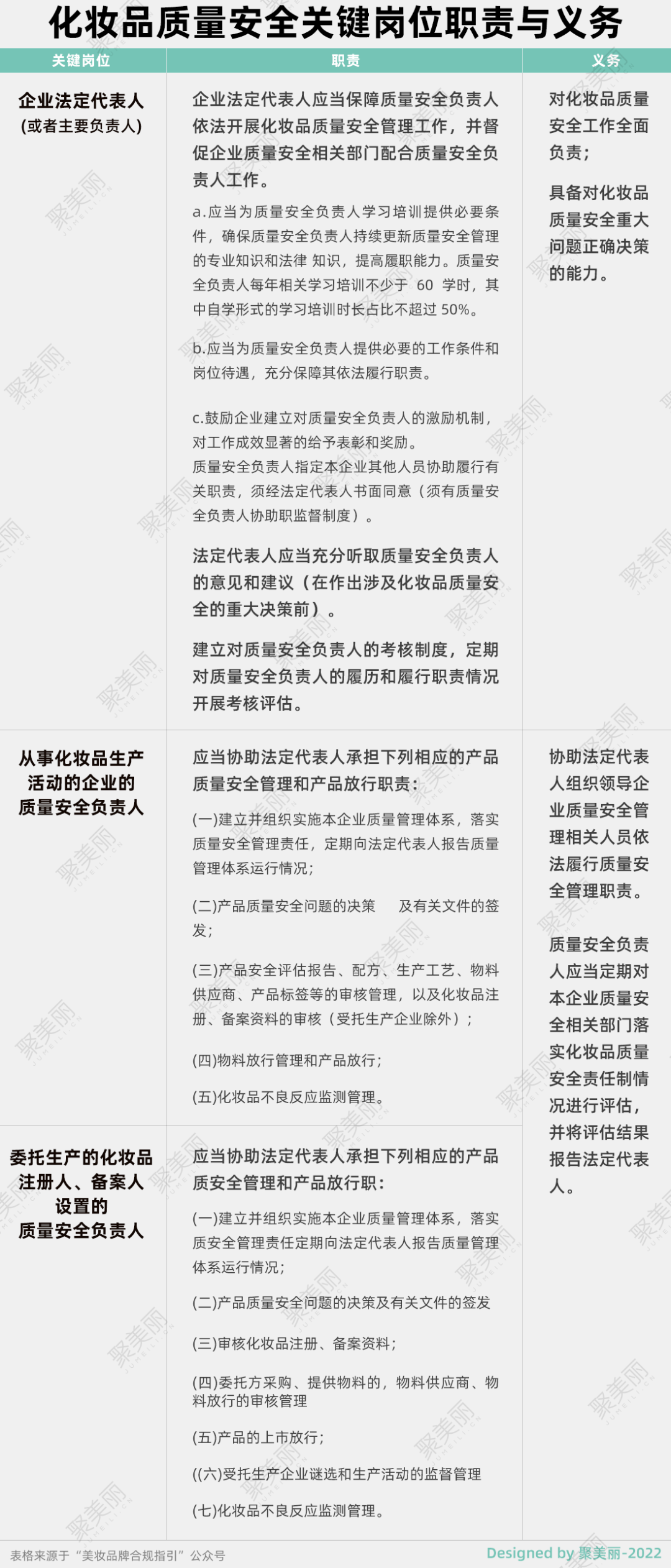 此次征求意見稿中,化妝品企業(yè)“質(zhì)量安全負(fù)責(zé)人”這一崗位的相關(guān)規(guī)定占據(jù)了很大的篇幅?!痘瘖y品監(jiān)督管理?xiàng)l例》第三十二條明確,化妝品注冊人、備案人、受托生產(chǎn)企業(yè)應(yīng)當(dāng)設(shè)質(zhì)量安全負(fù)責(zé)人。