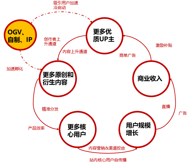 但是社區(qū)就完全不同。社區(qū)的內(nèi)容由用戶生產(chǎn),雖然在經(jīng)營UP主上依然有一定成本,但是這個成本在邏輯上是可控也可持續(xù)降低的。更重要的是,社區(qū)內(nèi)容所吸引來的用戶,會進(jìn)一步轉(zhuǎn)化為內(nèi)容的供給方。社區(qū)在內(nèi)容領(lǐng)域是唯一可以生生不息完成內(nèi)容資產(chǎn)累積,并與用戶規(guī)模增長形成正向循環(huán)的產(chǎn)品形態(tài)。也就是說,理論上,社區(qū)產(chǎn)品越做到成熟,內(nèi)容的邊際成本越低,增長成本越低,未來的利潤空間越大。